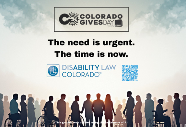 Colorado Gives Day is Tuesday, December 9th, and we’re asking our community to show up for disability rights. With major federal cuts putting critical advocacy at risk, your donation helps Disability Law Colorado continue serving people with disabilities in every corner of Colorado. Thank you for giving protection, voice, and justice—statewide. Click here to make donation now!